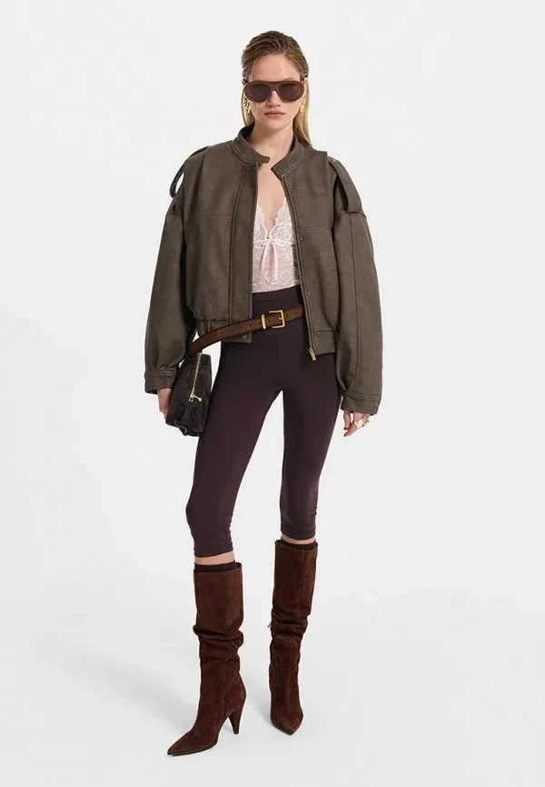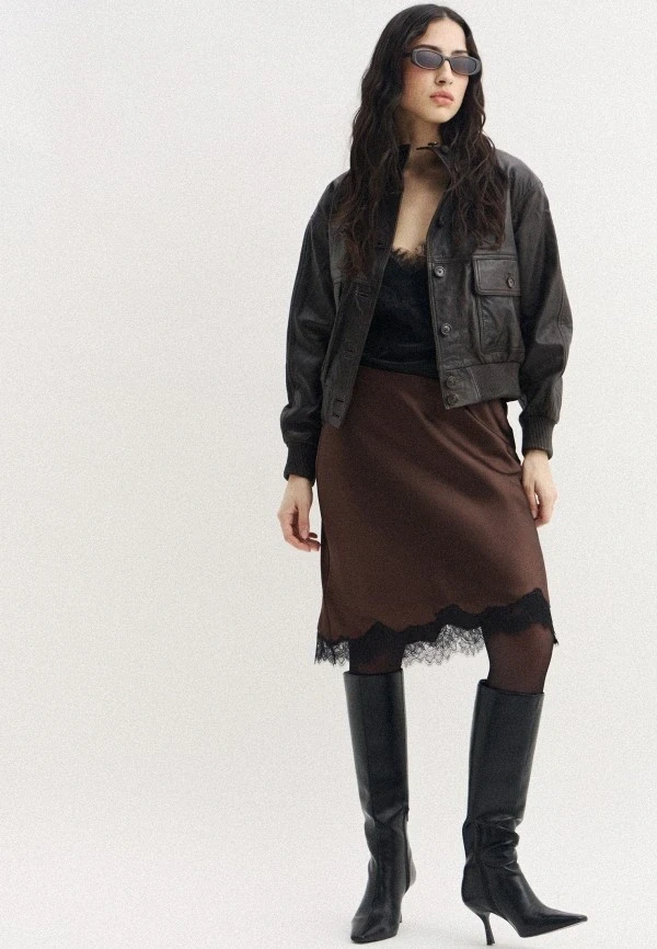 Если хочешь упаковать в один лук сразу все главные тренды сезона — вот твоя формула. Кожаная куртка оверсайз (можно мужского кроя, можно со спущенным плечом) + обтягивающие леггинсы или скинни + высокие замшевые сапоги. А теперь самое интересное: добавляем элементы бельевого стиля. Это может быть шелковая майка-комбинация под курткой, кружевной топ, который чуть выглядывает из-под свитера, или даже корсет поверх базовой футболки.