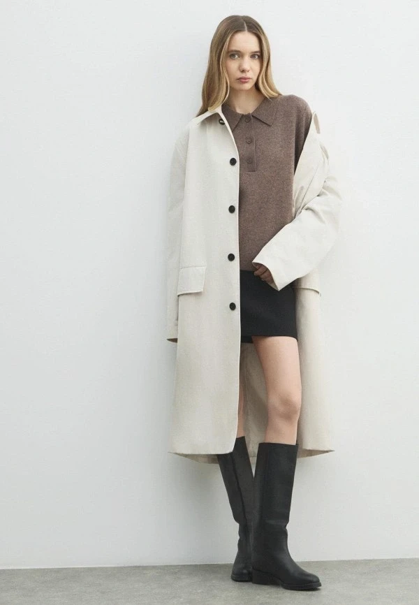 Вот она, формула для тех, кто ценит элегантность, но не готов жертвовать комфортом. Свитер-поло — вещь гениальная: воротник добавляет аристократизма, но при этом ты в трикотаже, а не в жесткой рубашке. Сочетаешь его с мини-юбкой (кожаной, джинсовой, шерстяной — выбирай по погоде), сверху накидываешь пальто или тренч, на ноги — высокие сапоги без каблука.