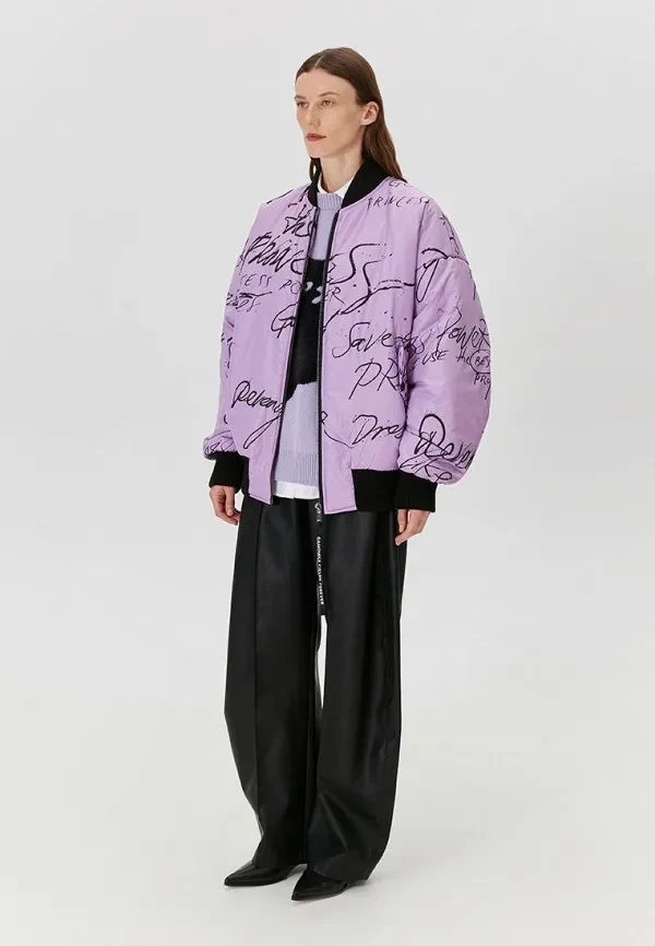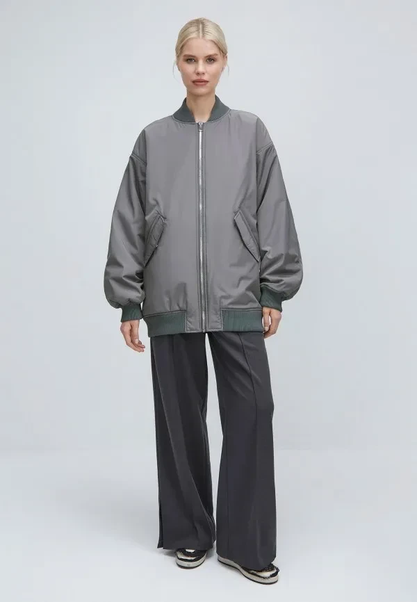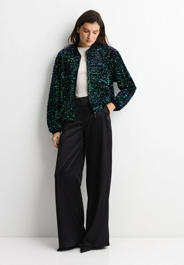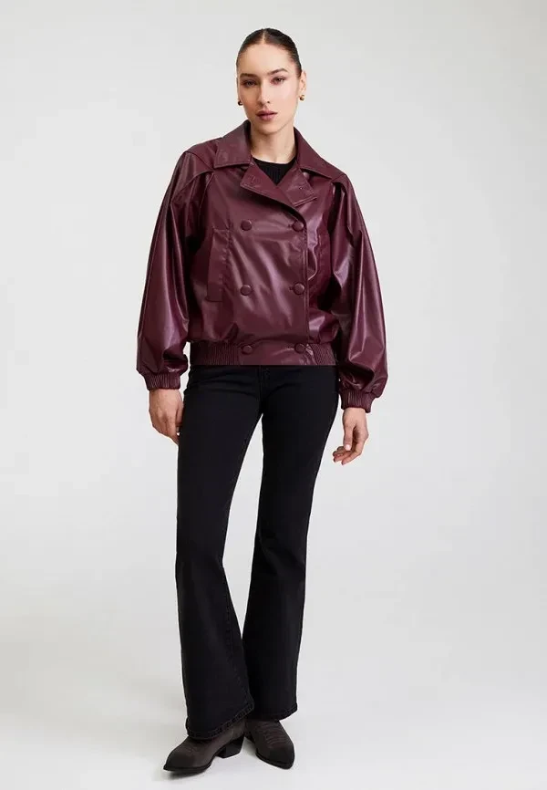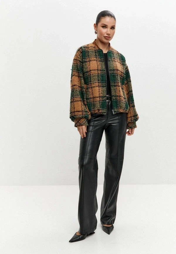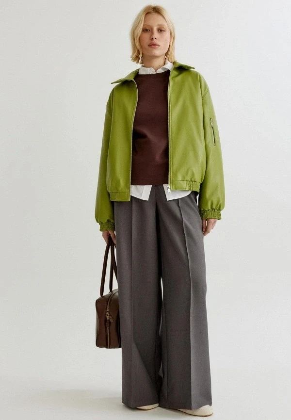 Этот образ для тех, кто хочет выглядеть так, будто контролирует ситуацию, даже если внутри легкая паника. Кожаный бомбер — вещь с характером, которая мгновенно добавляет интереса любому луку. Сочетаешь его с классическими брюками (прямыми, широкими или слегка зауженными), базовой белой или голубой рубашкой и свитером. Да, все вместе. Свитер также можно накинуть на плечи или завязать на поясе, получается такой продуманный беспорядок.