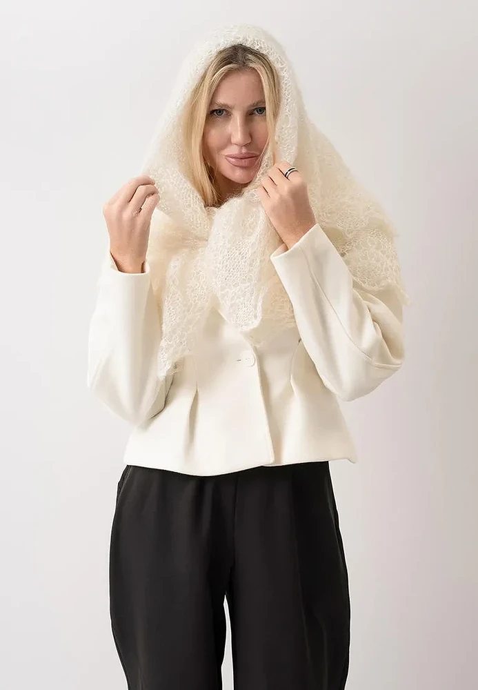 Как носить кружевной платок? Самый очевидный вариант — повязать на голову. Это работает и с распущенными волосами, и с низким пучком. Получается образ «я только что вернулась с прогулки по своему поместью». Второй способ — накинуть на плечи поверх блейзера или платья. Это добавляет в аутфит легкости и воздушности, что особенно круто работает, когда за окном уже весна, но еще не жарко.