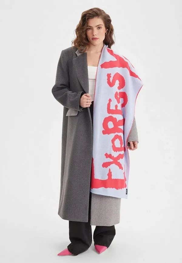 Шарфы с крупными надписями — для тех, кто не боится заявлений. Логотипы брендов, слоганы, философские цитаты, даже просто крупные буквы — все это крайне актуально в 2026-м. Этот тренд пришел из мира высокой моды, где дизайнеры давно поняли: люди хотят не просто одежду, а возможность что-то сказать.