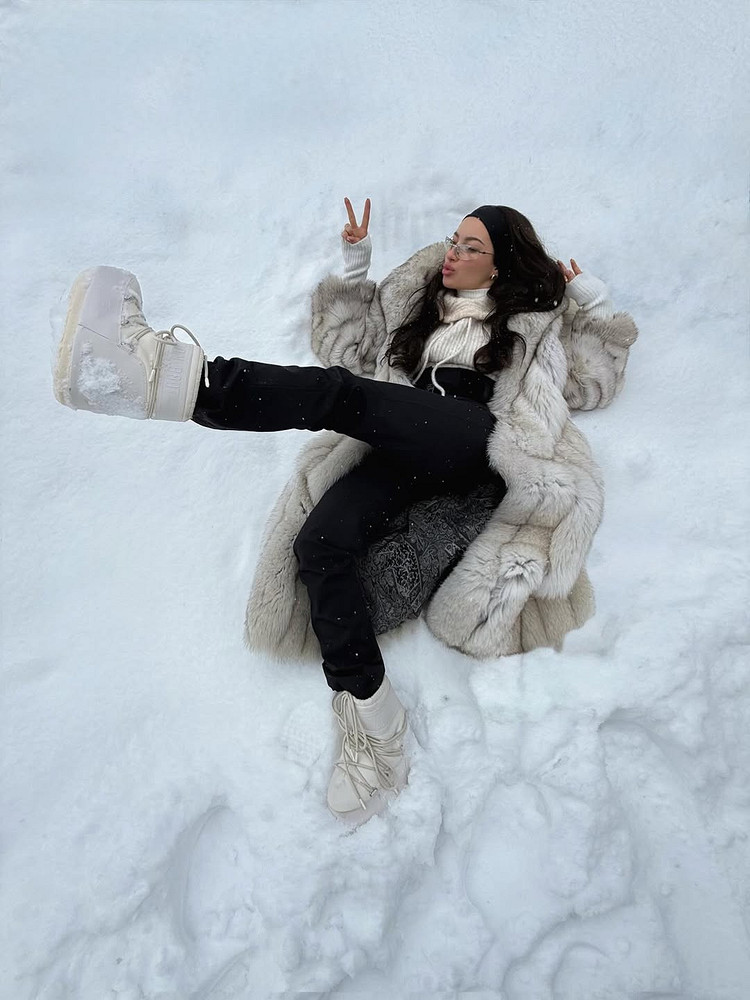 Белая шуба из искусственного меха в паре с молочными брюками, светлым свитером оверсайз (обувь, конечно, тоже в цвет) — классика, которая никогда не стареет. Этот лук родом из ленты соцсетей где-то 2016 года, когда минимализм только набирал обороты, а все поголовно носили Céline.