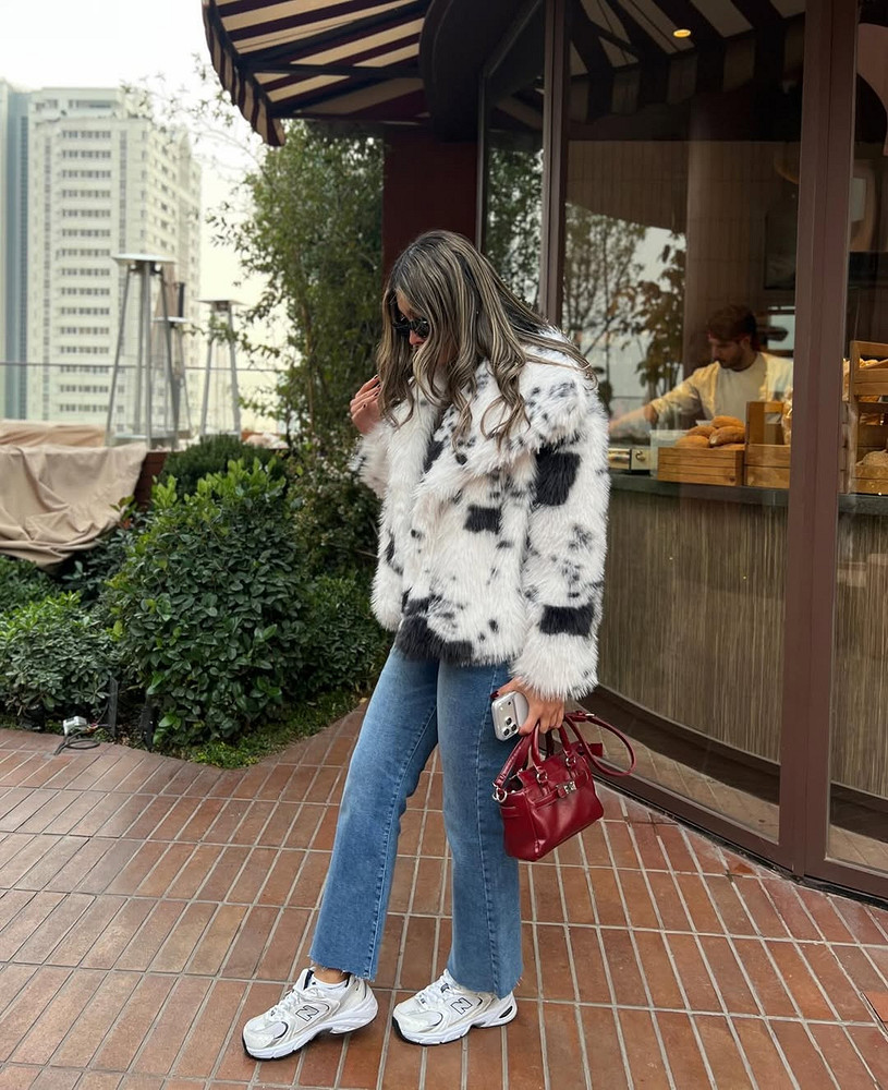 Леопардовая или яркая короткая шуба — центр композиции. Все остальное должно быть нейтральным: серый худи, черные джоггеры, белые кроссовки. Бейсболка — финальный штрих, который говорит «я не стараюсь, мне и так хорошо». Крайне важно: обувь должна быть чистой. Грязные кроссовки в этом луке — не про небрежность, а про неряшливость.