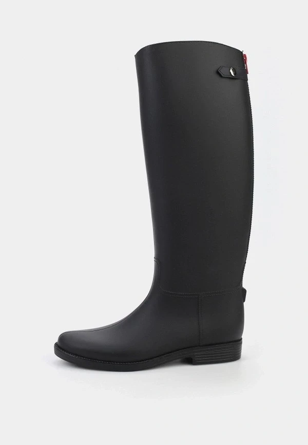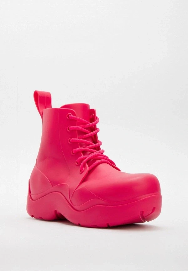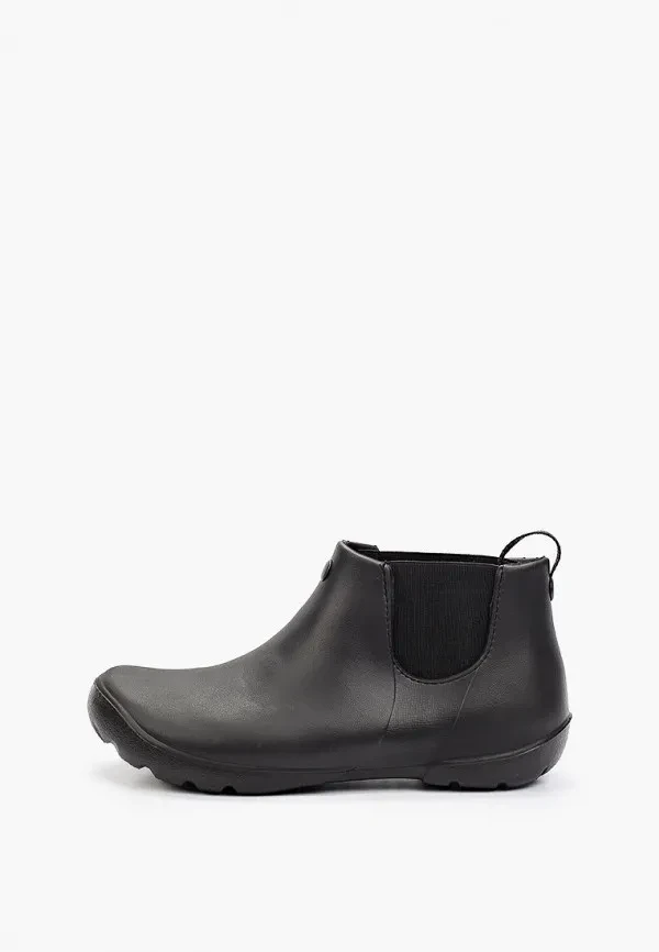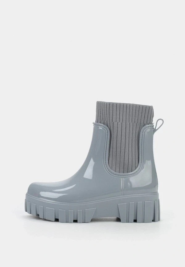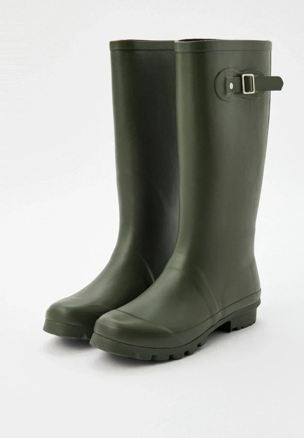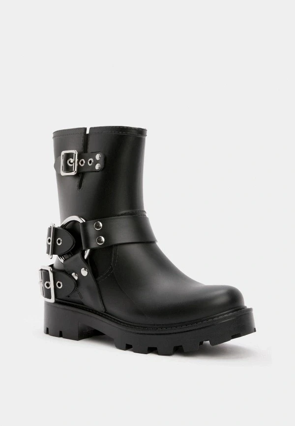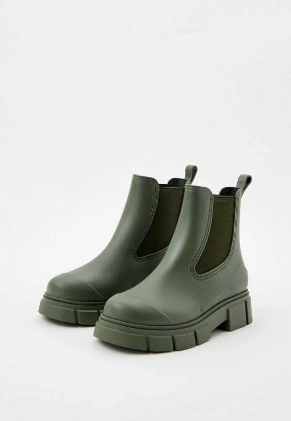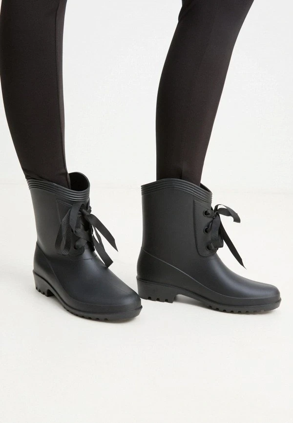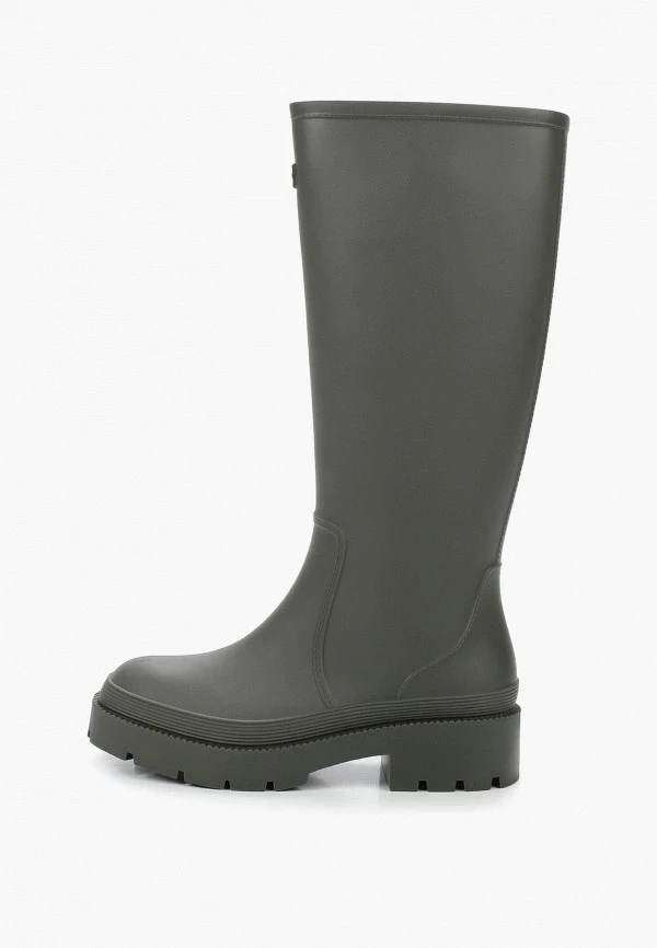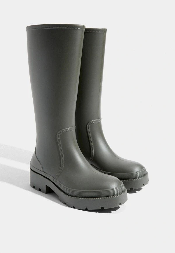 Модели на выраженной подошве от 4 до 7 сантиметров сейчас активно выпускают почти все бренды, работающие с резиновыми сапогами. Выбирай те, где платформа равномерная — это важно и для устойчивости, и для пропорций. Массивная подошва с грубым протектором смотрится очень убедительно с широкими прямыми джинсами или длинной юбкой.