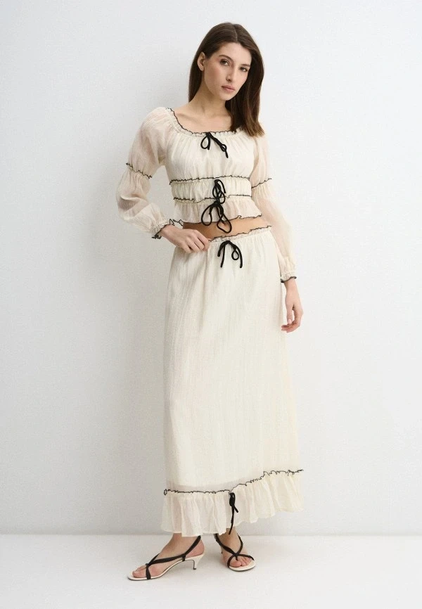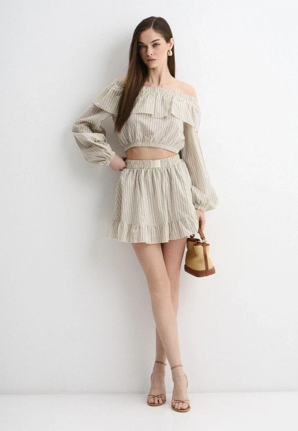 Что надеть под пиджак: тонкий топ или боди в тон юбке. Кружевной топ, если хочется романтики. А вот от блузок с рюшами лучше отказаться, так как пиджак уже взял на себя всю структуру.