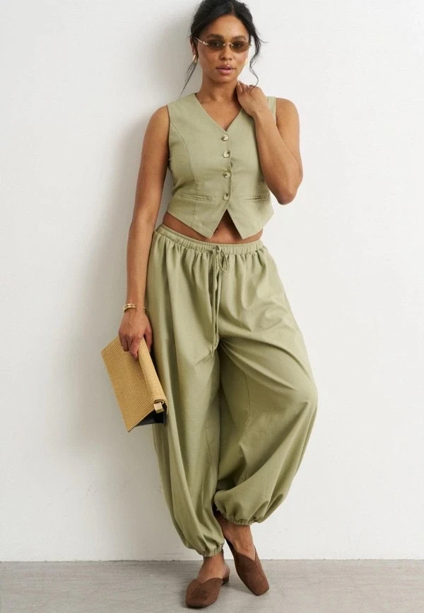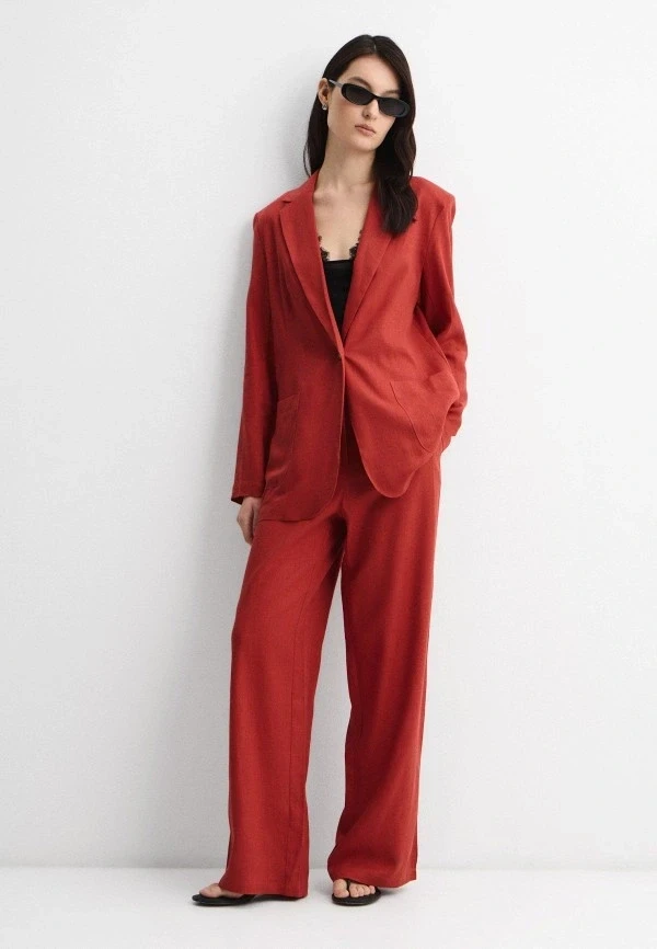 Отдельная история — цвет брюк. Если пиджак нейтральный (бежевый, серый, белый), брюки могут быть акцентными: терракотовые, изумрудные, пыльно-розовые. Это работает при одном условии: обувь и сумка не спорят с брюками, а поддерживают их. Ну и, конечно, ты всегда можешь сделать выбор в пользу монохромного комплекса.