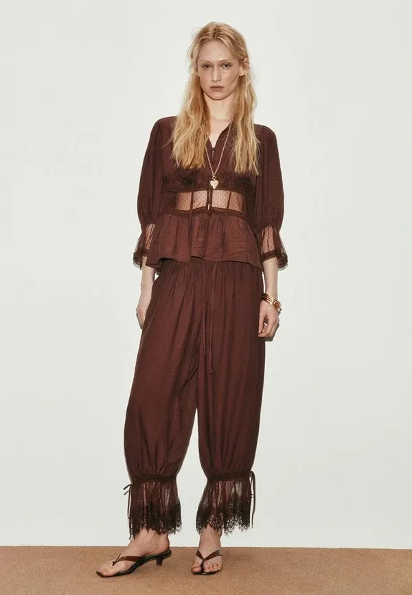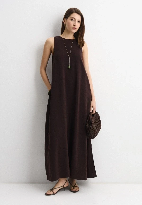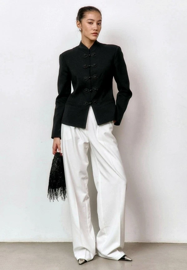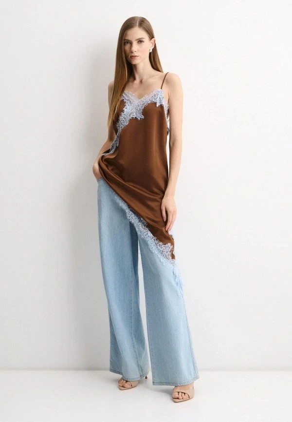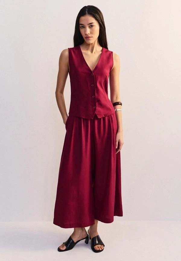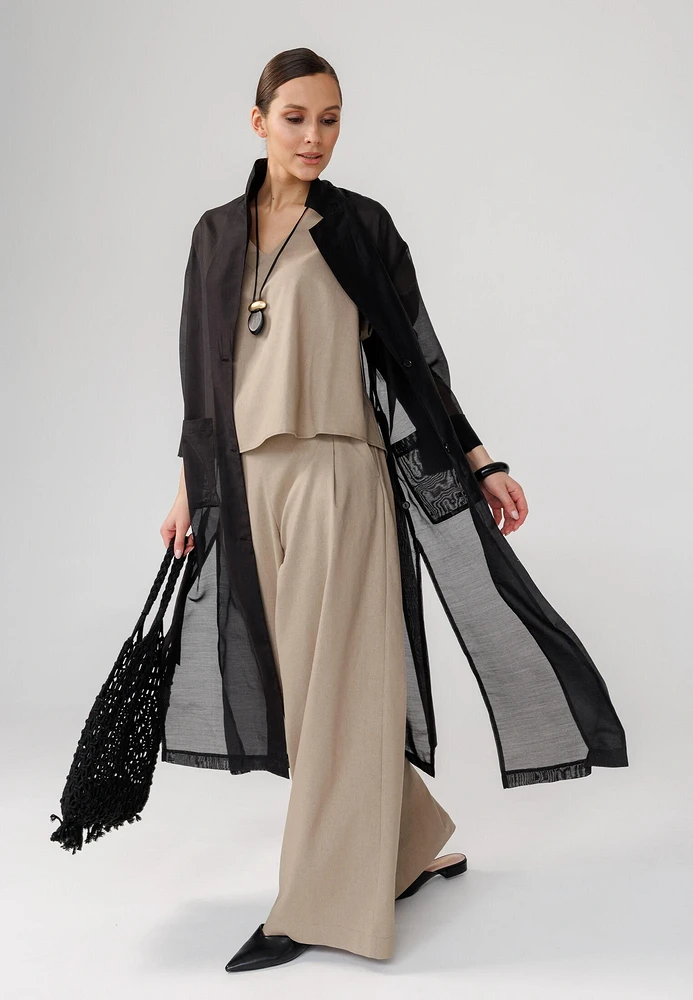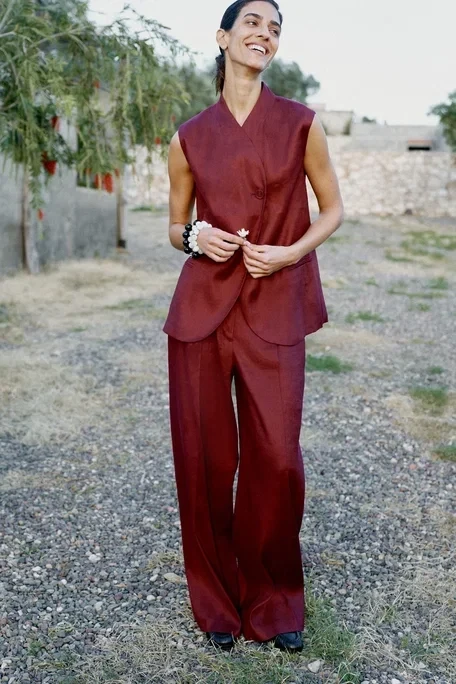 - Мягкие, текучие силуэты. Брюки с высокой посадкой и плавным расширением от бедра, платья с запахом, асимметричные топы — линии, но не объем ради объема. Такая одежда работает на вертикаль: она визуально удлиняет, выстраивает пропорции, делает образ законченным даже без каблуков.