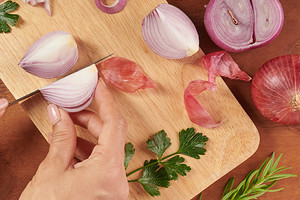 • Используй только очень острый нож для нарезки. Хорошо заточенное лезвие не разрушает большое количество клеток в процессе, а значит сок будет выделяться гораздо меньше. Для лука не подходит нож с зубчиками — он разрушает волокна овоща и способствует выделению газа.