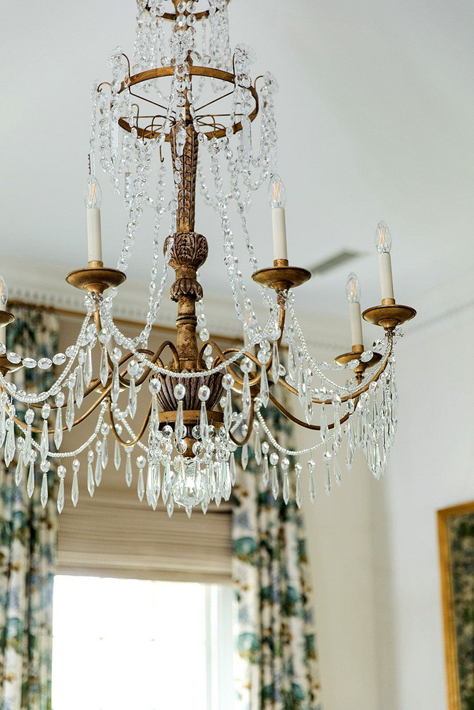 Свет должен быть мягким и теплым. Идеально подойдут светильники с бумажными или тканевыми абажурами —– они распространяют рассеянный желтоватый свет. Красиво будут смотреться люстры со множеством рожков из латуни и хрустальным декором. Также используют белые каркасные люстры с коваными элементами или имитацией старины.