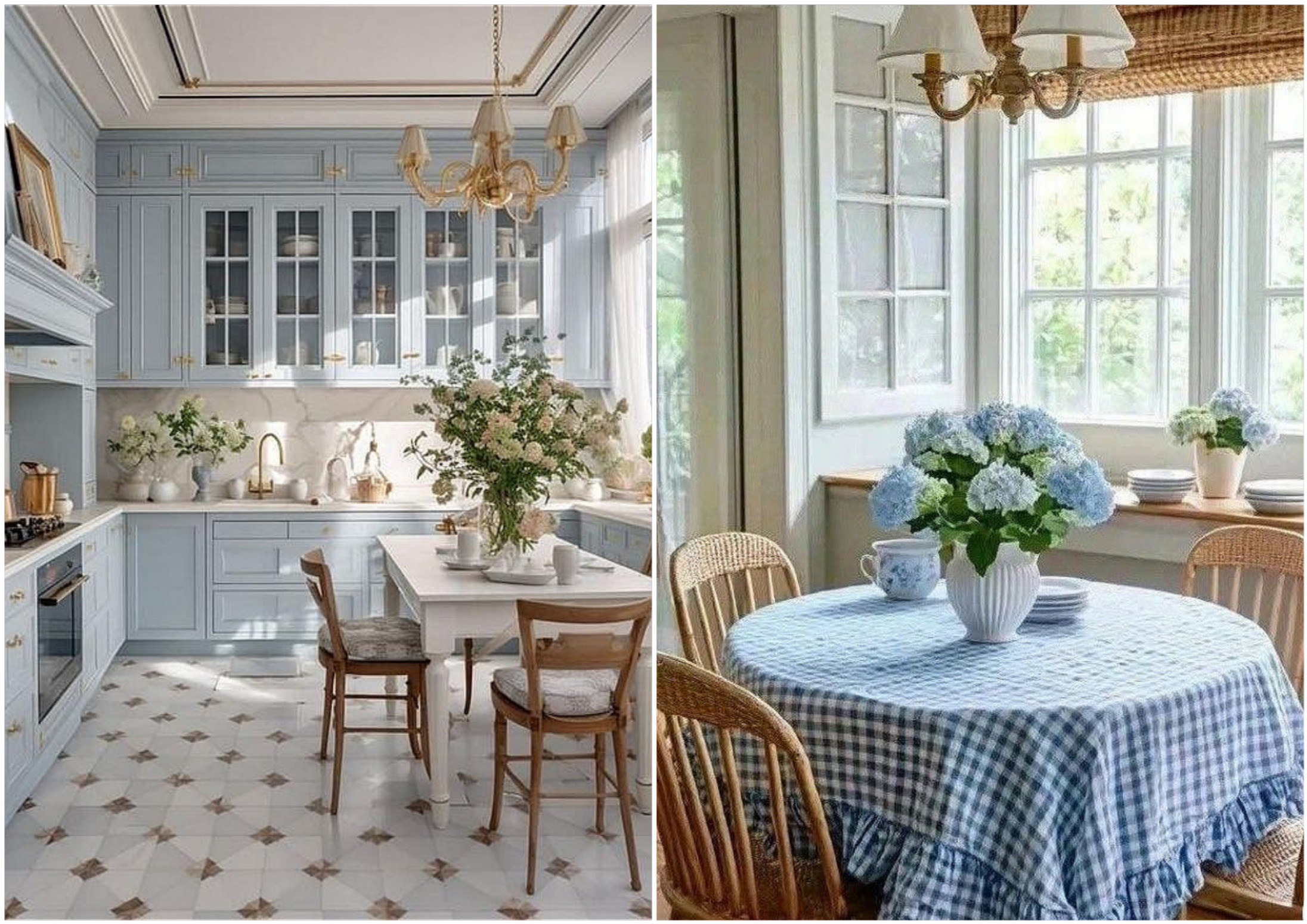 - голубой + слоновая кость + синий — идеально для кухонь и ванных комнат;