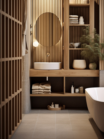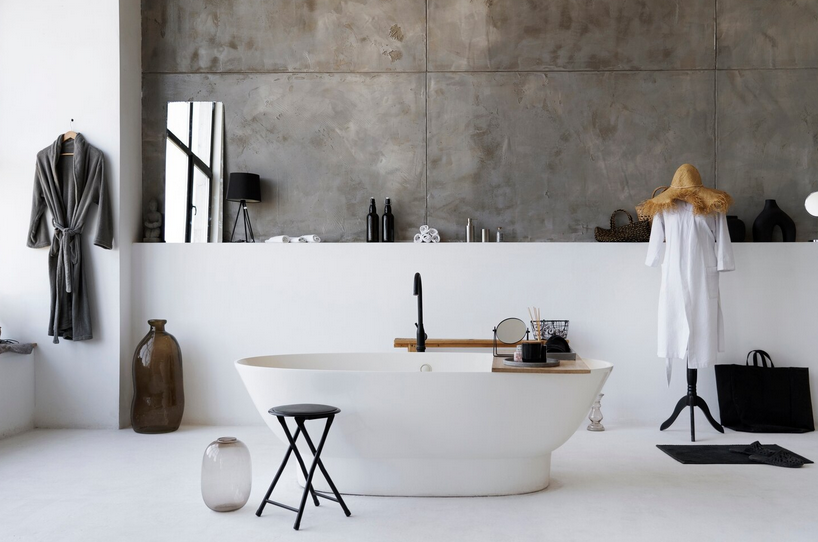 Для хранения лучше выбрать не закрытые шкафчики, а оставить пару открытых полок или поставить этажерку из дерева. Полотенца и средства гигиены стоит разместить в плетеных корзинах, для зубных щеток подойдет стакан из керамики или бетона. Полотенца можно сложить в плетеную корзину для белья или ящик, убрать под раковину или в угол. Для полотенец повесь небольшие крючки, которые не занимают много места.