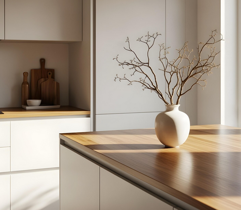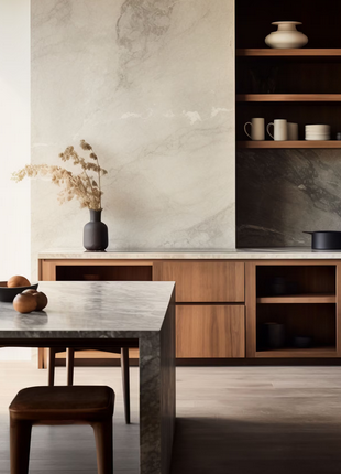 В зоне для приготовления еды гармонично смотрится стиль ваби-саби с использованием природных материалов. Шкафчики для посуды можно оформить фасадами из дерева. Постепенно они покроются узором из трещинок и станут более фактурными. Столешница подойдет из гранита или мрамора, а угол для приготовления блюд можно оформить массивом дерева со специальной пропиткой.