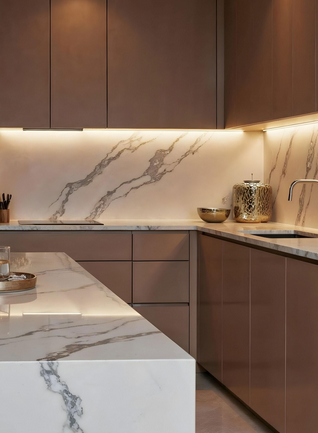 - Иногда можно схитрить. Полы из паркетной доски, столешница из мрамора и натуральная отделка стен стоят недешево. Чтобы уложиться в бюджет, можно взять материалы с имитацией природной текстуры. Например, подобрать плитку из керамогранита, рельефные обои или отделку стен с имитацией камня.