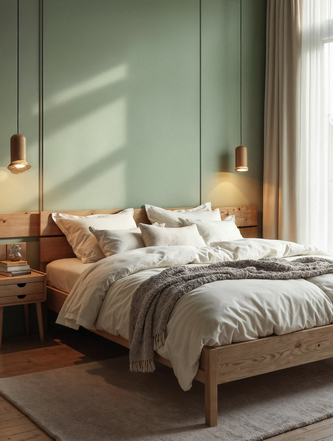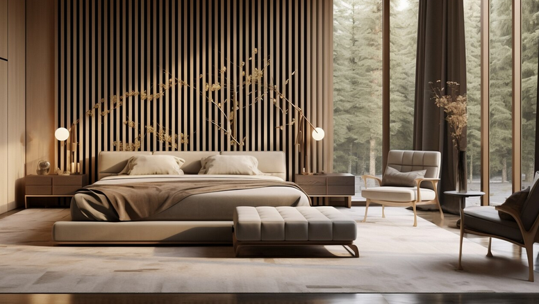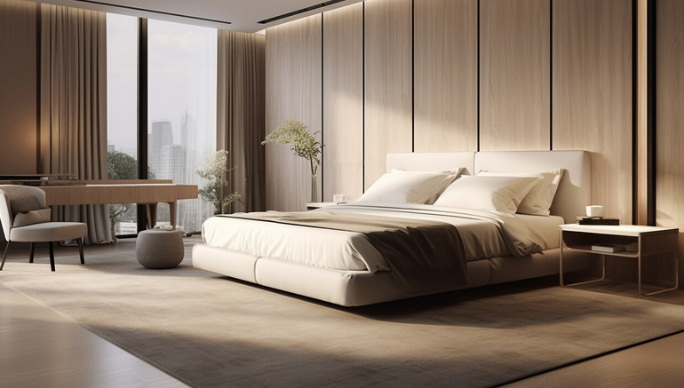 Цветовую гамму лучше выбрать в нейтральных естественных оттенках: кремовый, бежевый, приглушенный зеленый или коричневый. Важна натуральность и возвращение к природе. Декор должен быть неброским — пара свечей на туалетном столике, минималистичная картина с природными мотивами, простая ваза для цветов. Комнатные растения, расставленные не только на окне, но и на тумбочке, подставке или прямо на полу добавят уют.