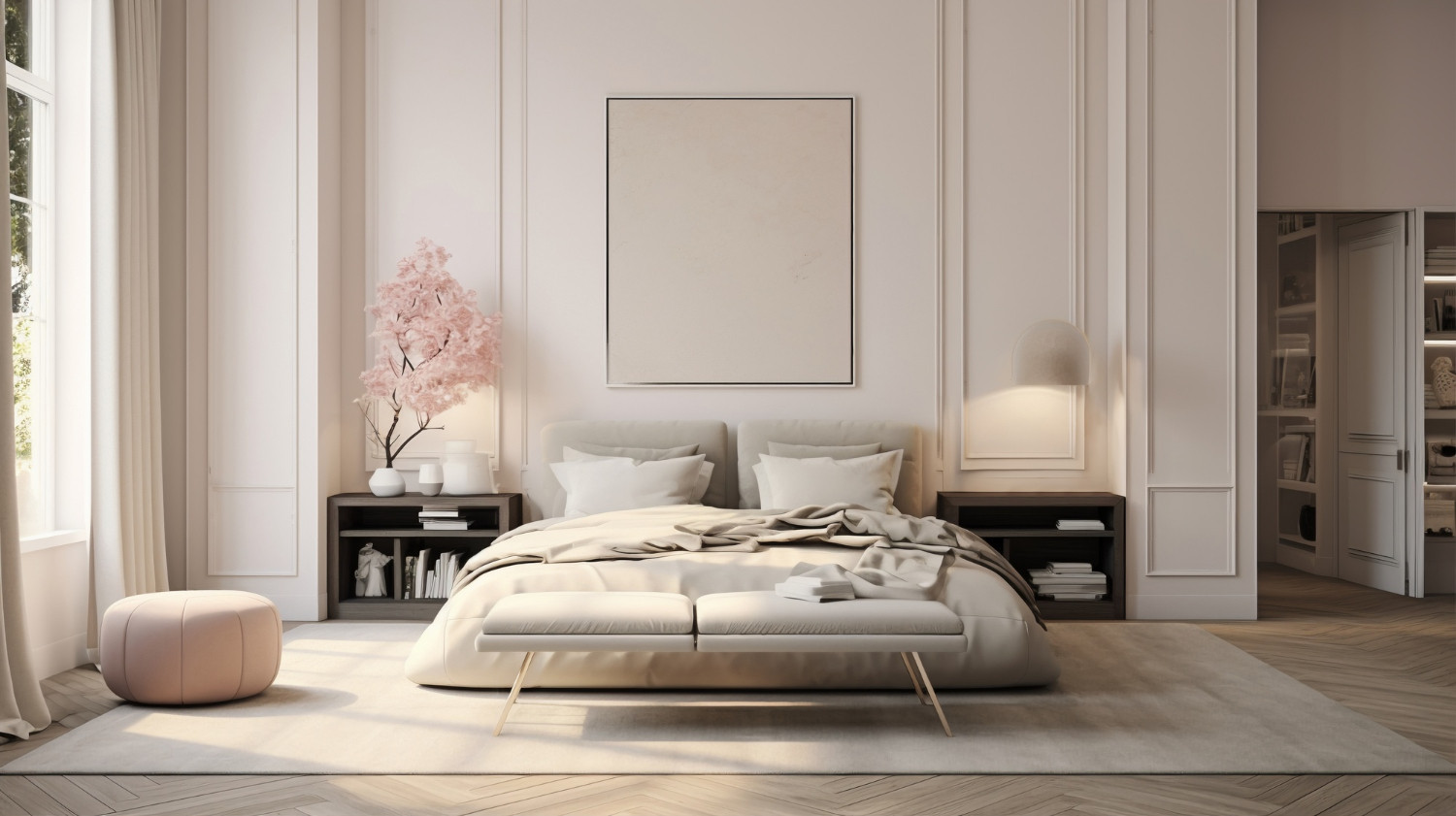 Главный предмет в комнате для сна — большая кровать из натурального дерева, застеленная однотонным постельным бельем в спокойной цветовой гамме. Для хранения стоит выбрать гардеробный шкаф с раздвижными дверями, чтобы убрать все лишние вещи и не создавать визуальный шум. Постельное белье можно разместить в небольшом старинном комоде, деревянном ящике или плетеной корзине. Ящик можно поставить в угол комнаты или убрать под кровать.