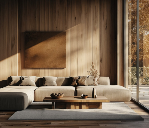 В оформлении интерьера используются природные материалы с выраженной текстурой. Встречаются изделия из камня, льна, глины, дерева и хлопка. Поверхности выглядят неотшлифованными, грубыми, с естественной фактурой и изъянами: трещинками, потертостями или сколами, которые появляются от времени. В отделке стен используется штукатурка без тщательной шлифовки, минималистичный бетон или краска с переходом цвета и подтеками.