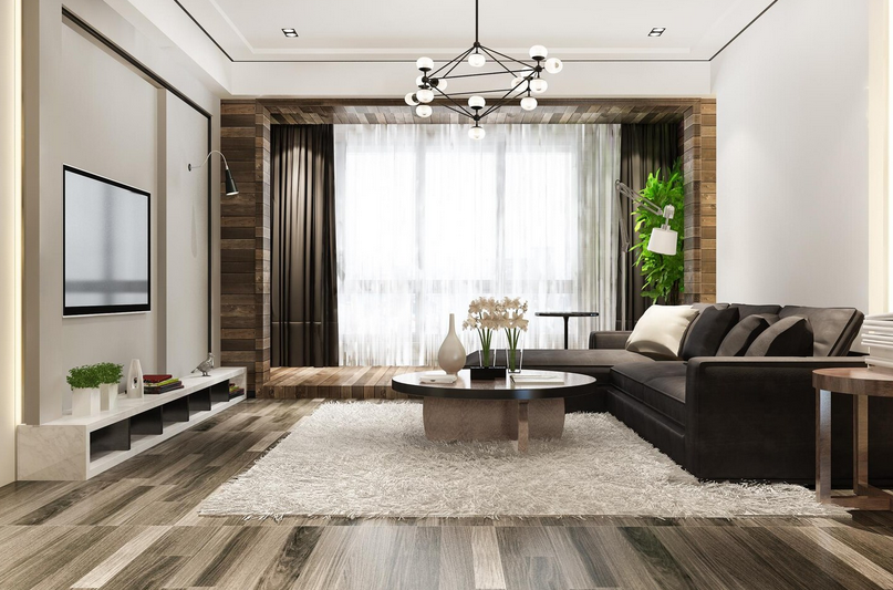 Чтобы оформление не выглядело однообразным, можно чередовать более светлые и темные тона, использовать несколько разных фактур и материалов. Светлые стены обрамляют мебелью из темного дерева. Пол не сливается со стенами, а отличается более темным оттенком. Важно соблюдать баланс и создать эффект глубины в пространстве, сделать его динамичным, не забывая про естественность.