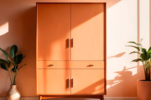 - Затем шкаф нужно покрасить. Можно использовать несколько цветов. Например, центральную часть дверок покрасить в светло-бежевый, а рамки и боковые детали покрасить в более яркий цвет. Рисунок нанести на дверцы, используя тот же цвет, что и для боковых частей.
