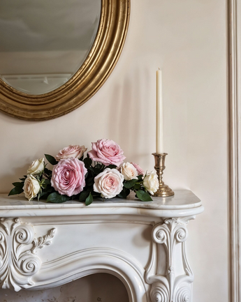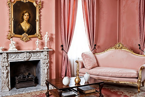 - Стены окрашивают в пастельной гамме или оформляют обоями в мелкий цветочек или тонкую вертикальную полоску. Могут быть деревянные панели или декоративная штукатурка, имитирующая старину. Можно использовать декоративное покрытие с эффектом растрескавшейся стены. Используется лепнина с цветочными украшениями.