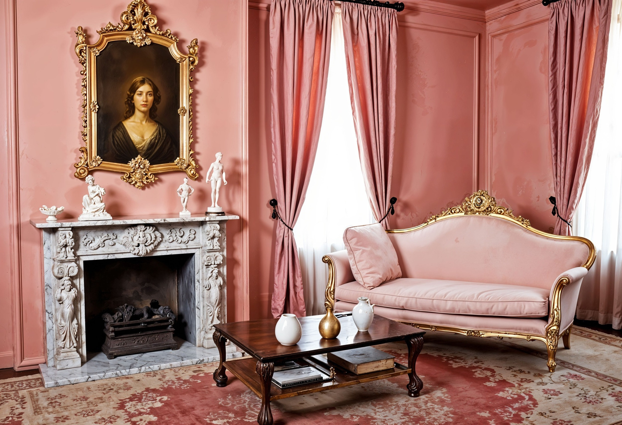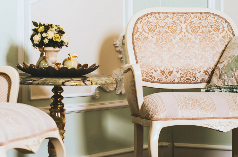 Декор и мебель должны быть в той же цветовой гамме, что и стены, без контраста. Металлические элементы могут быть бронзовыми, золотыми или серебряными, но с потертостями. Они могут быть состаренными искусственно или потемневшими с годами.