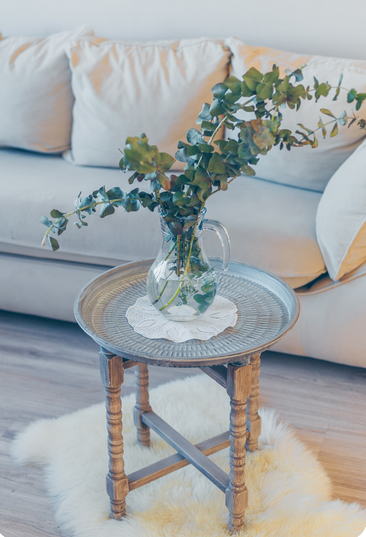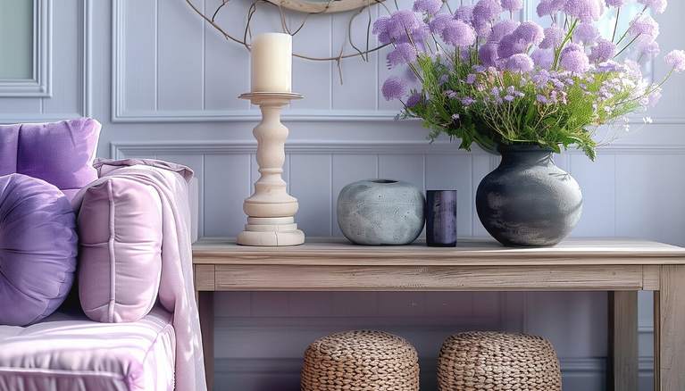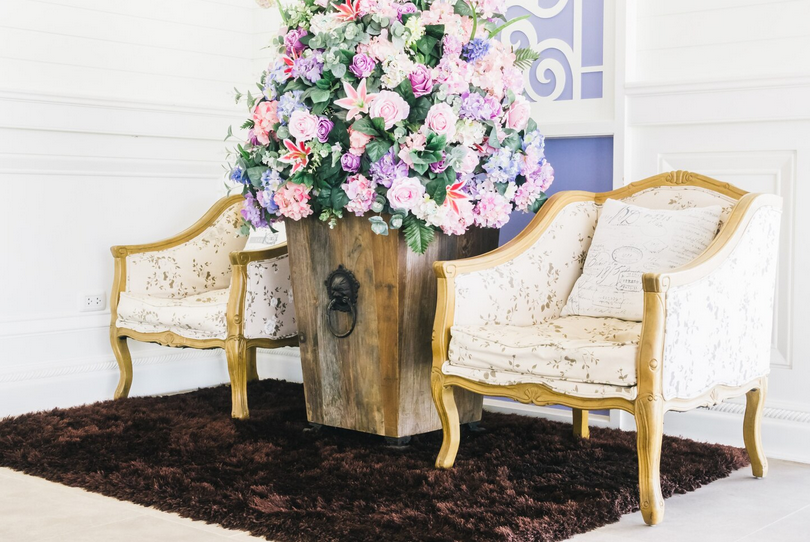 В интерьере обязательно должны быть как крупные, так и мелкие декоративные предметы. В просторной гостиной можно поставить дизайнерский комод с потертостями в светлой гамме. Мебель может быть состарена в технике браширования. Такие предметы почти невозможно отличить от старинных. Поискать старинные вещи для украшения интерьера можно на блошиных рынках. Пол украшают мягким ковром в нейтральной гамме. Дополнят интерьер живые растения в вазах или цветущие комнатные растения.