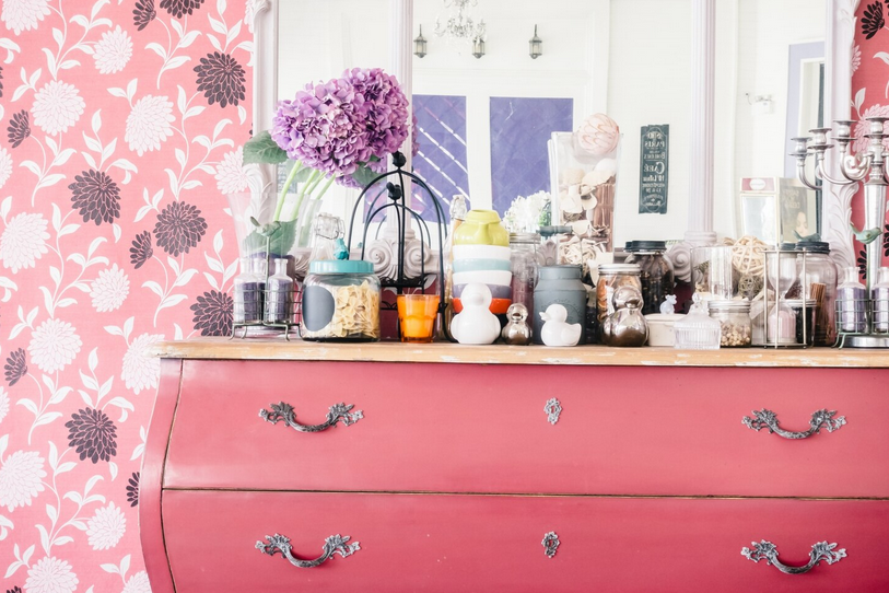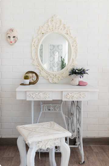 Хорошо будет смотреться деревянная мебель, покрытая полупрозрачным слоем светло-серой водоэмульсионной краски. Когда покрытие высохнет, останутся темные полосы, которые придадут потертый вид. Туалетный столик или сервант можно декорировать в технике декупаж, добавив цветочные мотивы.