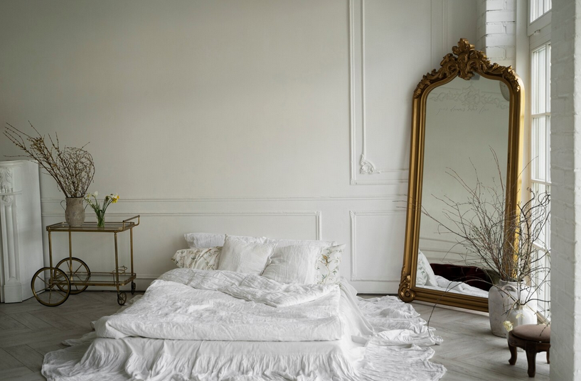 Комната для сна и отдыха должна быть теплой и уютной. Рабочий кабинет лучше перенести в гостиную, а в спальне оставить только кровать и туалетный столик. Кровать должна быть большая, с кованым или деревянным изголовьем. Можно дополнить место для сна тканевым пологом, чтобы скрыть его от посторонних глаз. Шкаф для одежды может быть старинным, из массива дерева и с декоративной резьбой. Для хранения белья стоит поставить комод с резными ножками. Мебель можно украсить позолотой с потертостями.