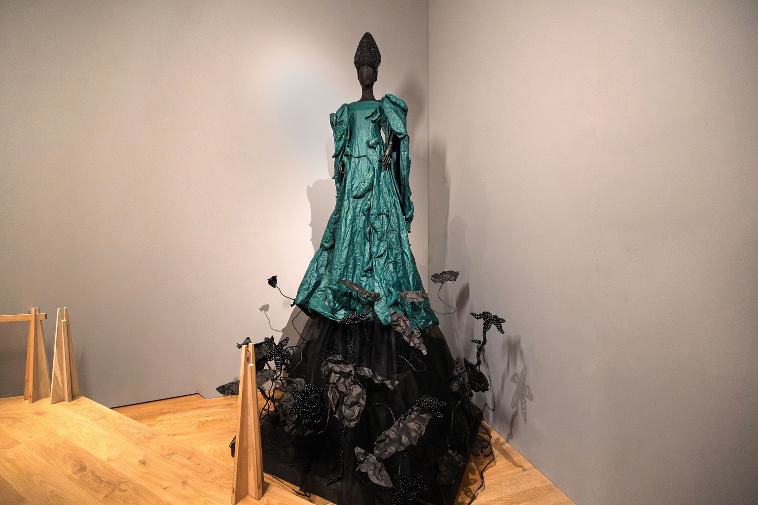 Совместный проект двух российских брендов стал признанием в любви своей стране, ее культуре и природе. Вдохновением для образа послужили национальные художественные традиции и природные мотивы. Платье таежного цвета с символичным названием «Волшебный лес» отсылает к образу русского народного костюма с длинными пышными рукавами и тонким силуэтом. Все швы выполнены в органичной, биоморфной эстетике – без прямых линий, словно повторяя пластику растительных форм. Платье украшено объемными 3D-листьями, выполненными в кутюрной ручной технике. На создание ушло 12 метров ткани из переработанного пластика и 120 часов работы закройщиков, швей и вышивальщиц.