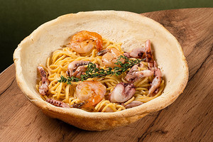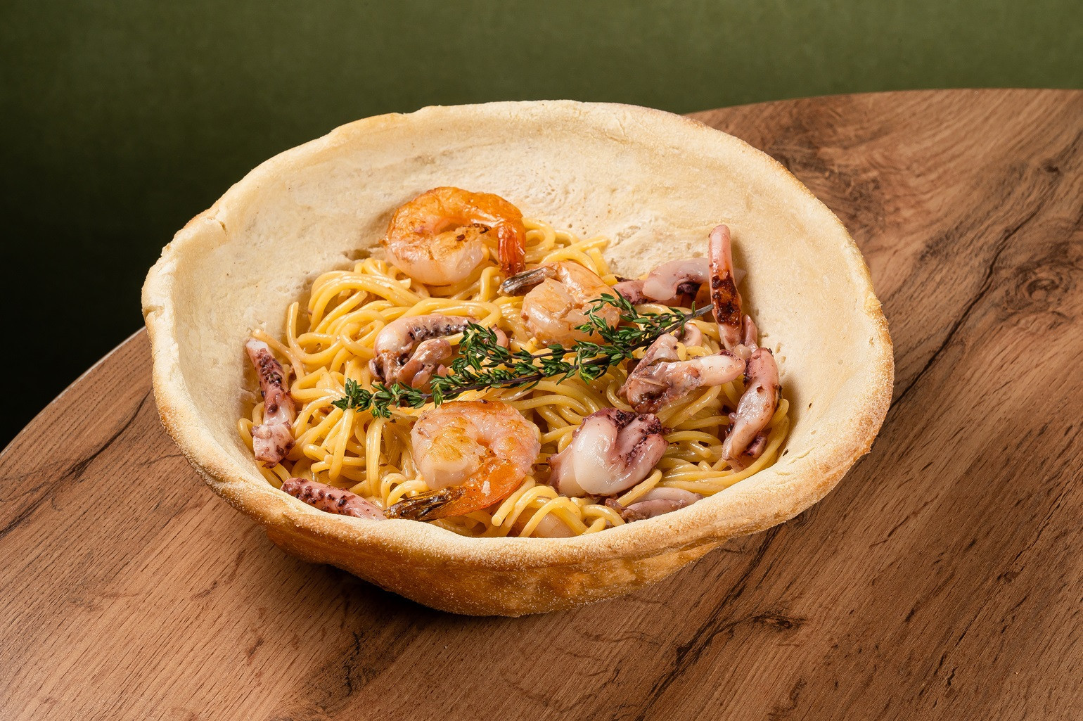 Большая порция спагетти на двоих в сливочно-томатном соусе с морепродуктами в съедобной тарелке из фирменного теста. Сначала — восторг от подачи, затем – от вкуса. И да, да, эту тарелку можно и нужно съесть: отламывать кусочки лепешки и макать в соус. Это так просто, но так по-итальянски.