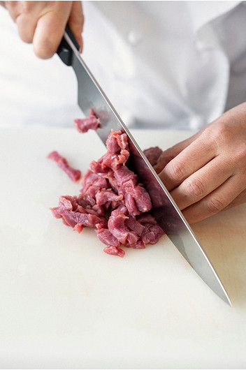 Сначала мелко нарезать мясо (чем мясо холоднее, тем легче это делать), затем порубить его тяжелым ножом или лучше двумя. Должен получиться фарш грубого помола. Посолить, поперчить и перемешать.