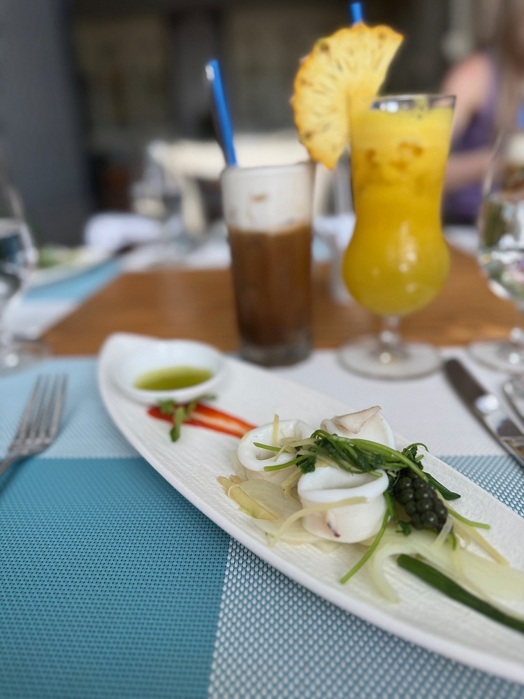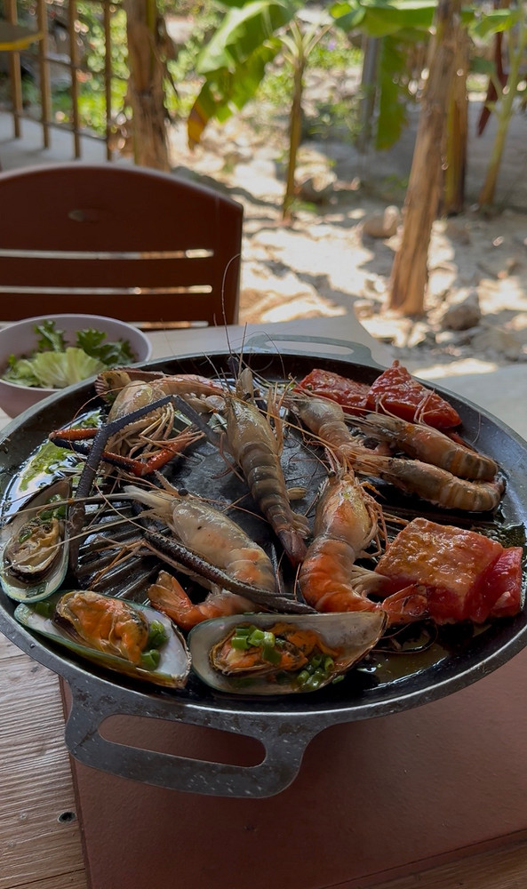На обед подают свежие морепродукты: креветки, гребешки, кальмары, мидии и устрицы. Их готовят прямо за столом на жаровне с углями, так что обед превращается еще и в маленькое гастрономическое шоу. Для тех, кто готов к экспериментам, в меню — крокодил на гриле.