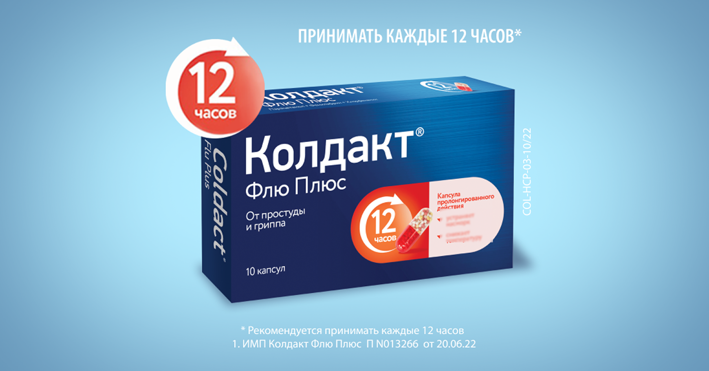 - Проверенная формула. Три активных компонента в оптимальной дозировке: парацетамол при боли и температуре, фенилэфрин при заложенности носа, хлорфенамин для уменьшения зуда и слезотечения, провоцирующих чихание и насморк. *1 ИМП Колдакт Флю Плюс П N013266/01-29.06.2017, Изм. № 1-2