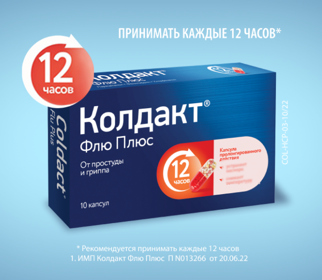 - Удобство приема. Одна капсула помогает избавляться от симптомов простуды и гриппа на период до 12 часов для активного рабочего дня1