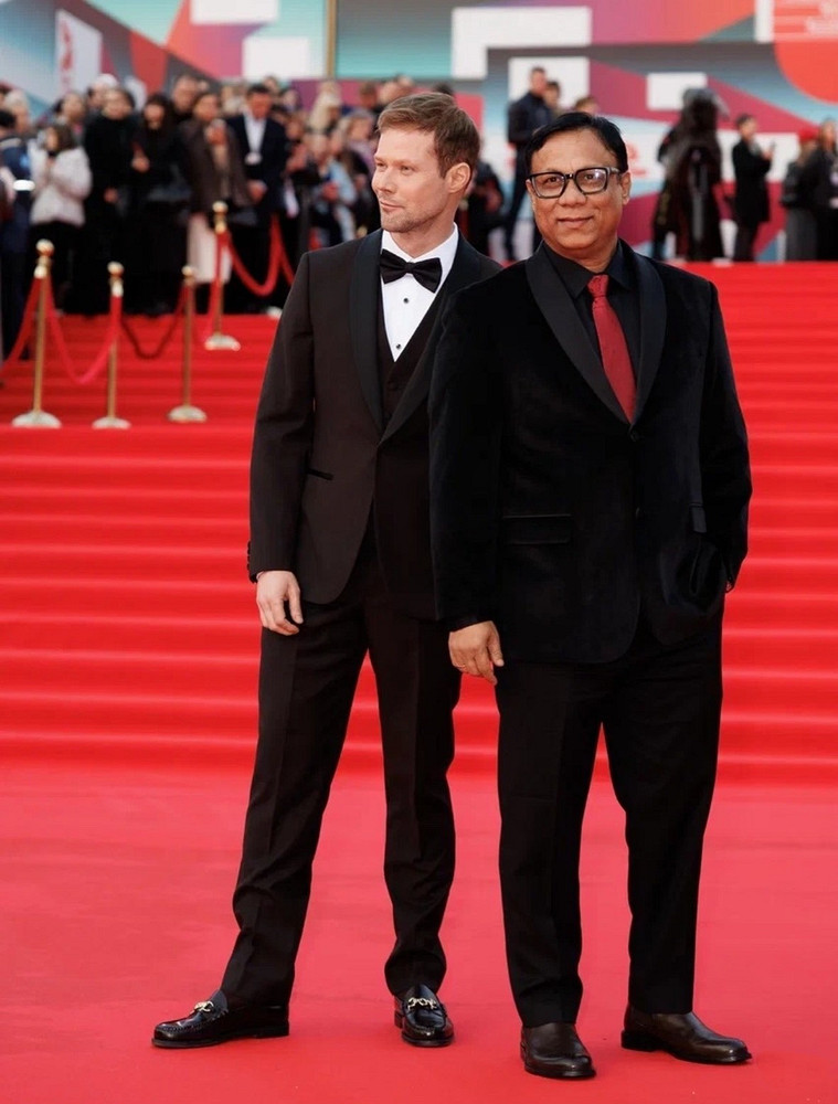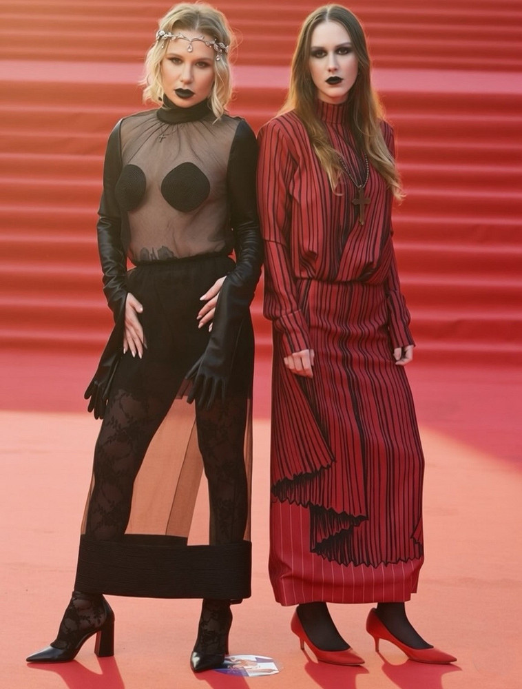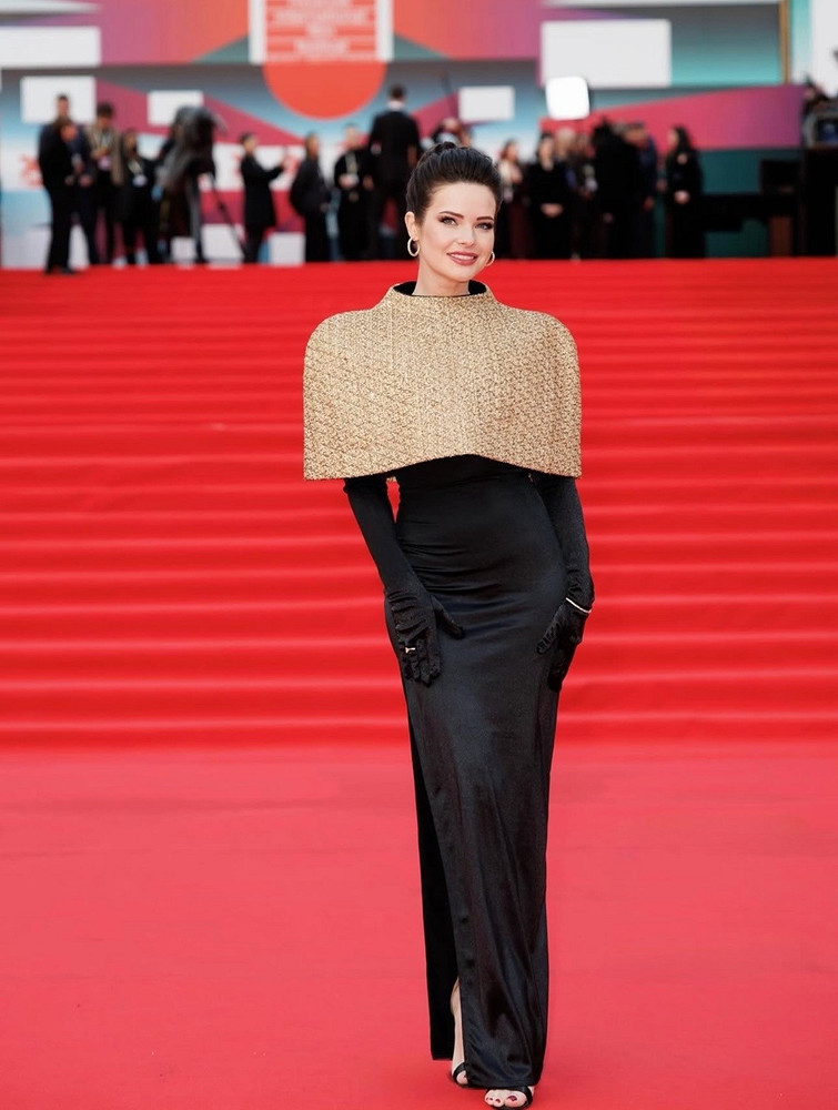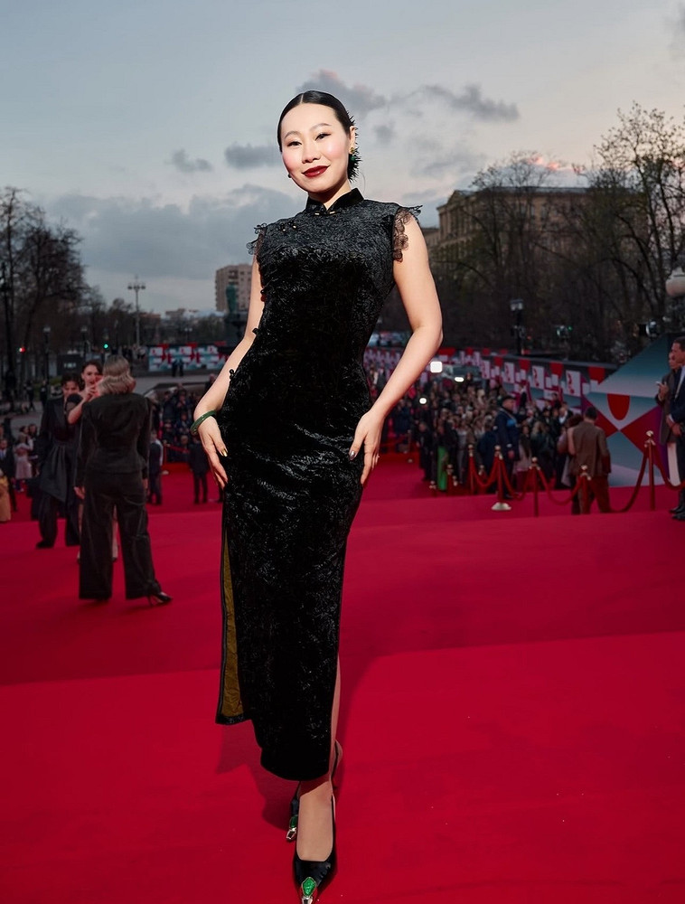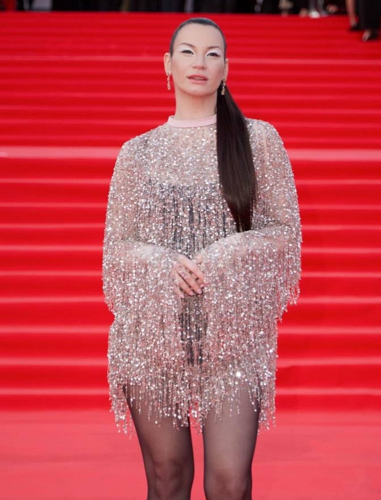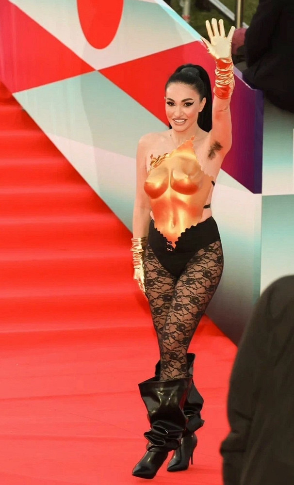 А вот и главные нарушители спокойствия ММКФ-2026. Ключевая фигура в провокации — Алина Ян. Ее золотой корсет, вылепленный как античный торс, кружевные колготки и намеренно демонстративная растительность на подмышках — это был не просто выход, а манифест телесности, разорвавший шаблоны красной дорожки.