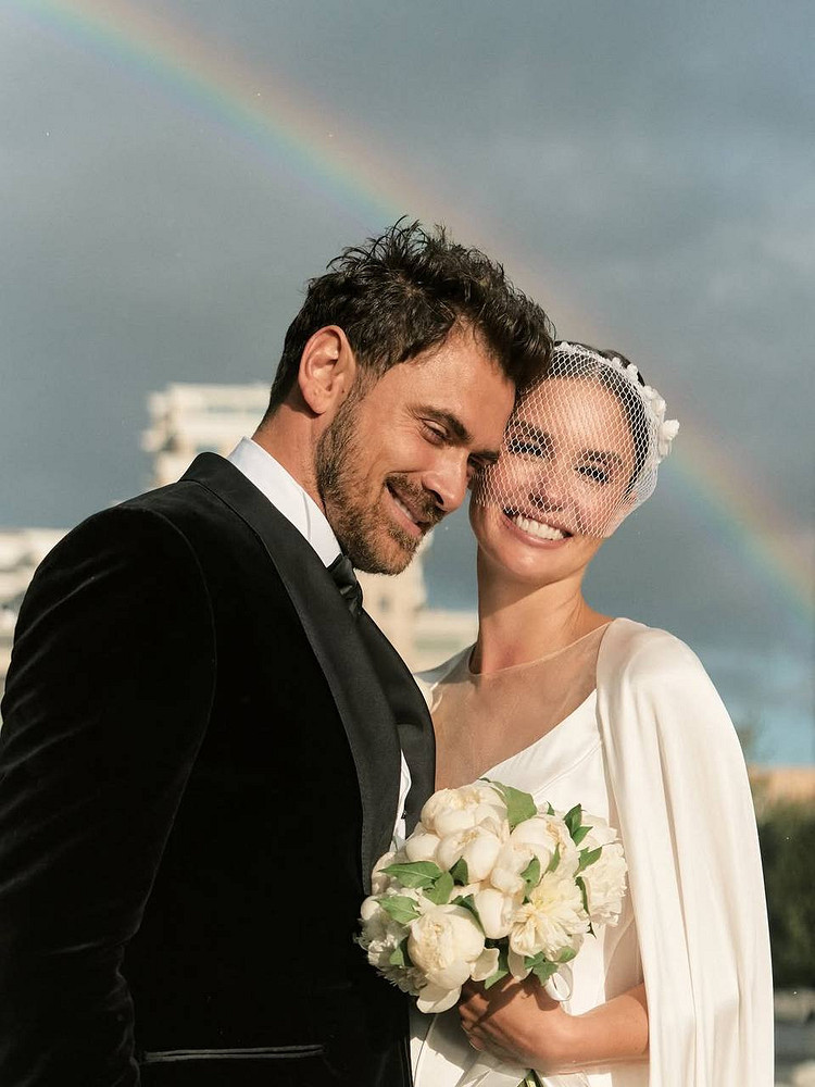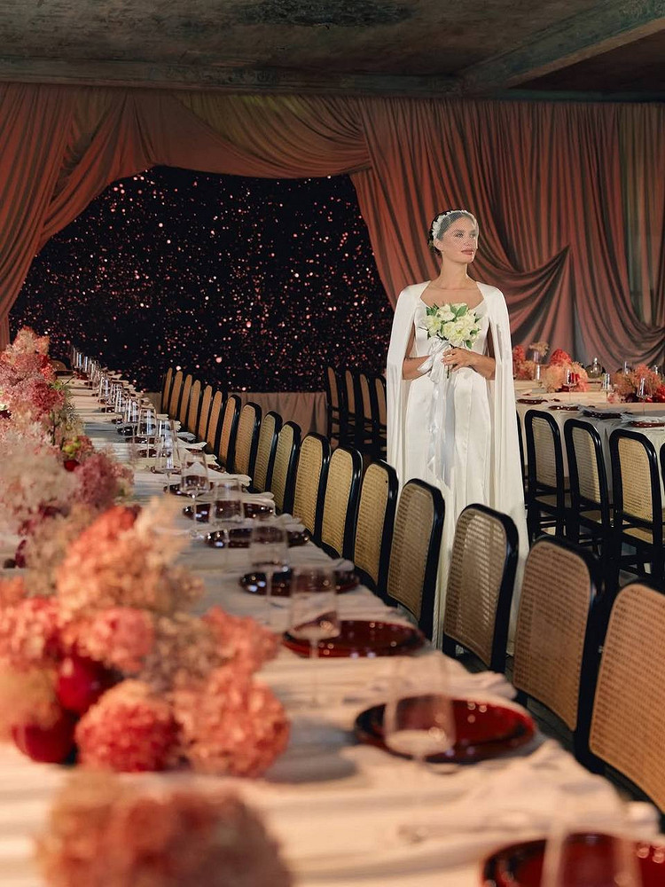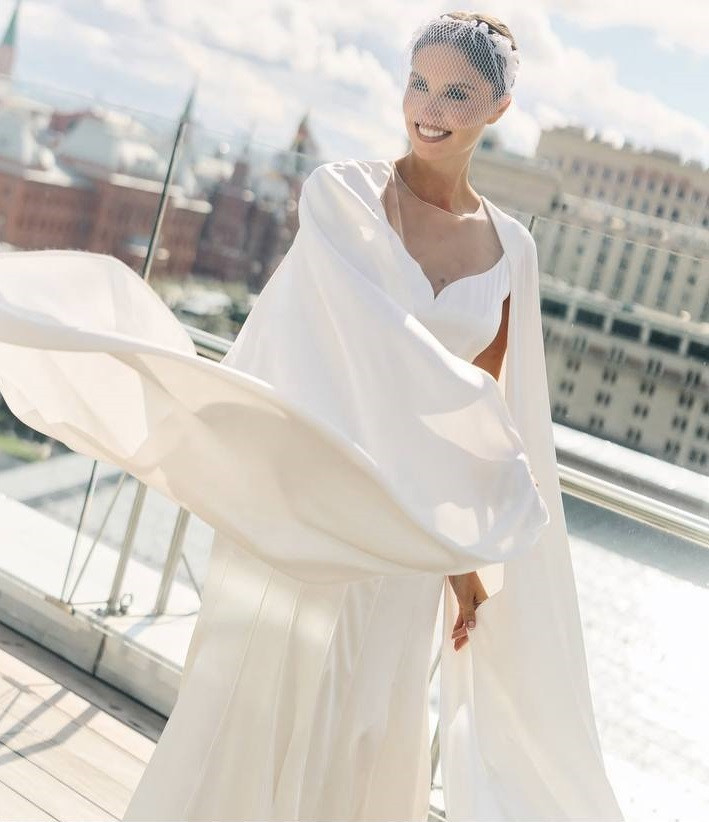 Агата, которая сейчас ждет рождения малыша, выбрала элегантное платье с накидкой и открытой спиной, а вместо фаты надела ободок с цветами и вуалью. Платье она заказывала в ателье Edem Couture — там же шили себе свадебные наряды Ксения Собчак и Ксения Бородина.