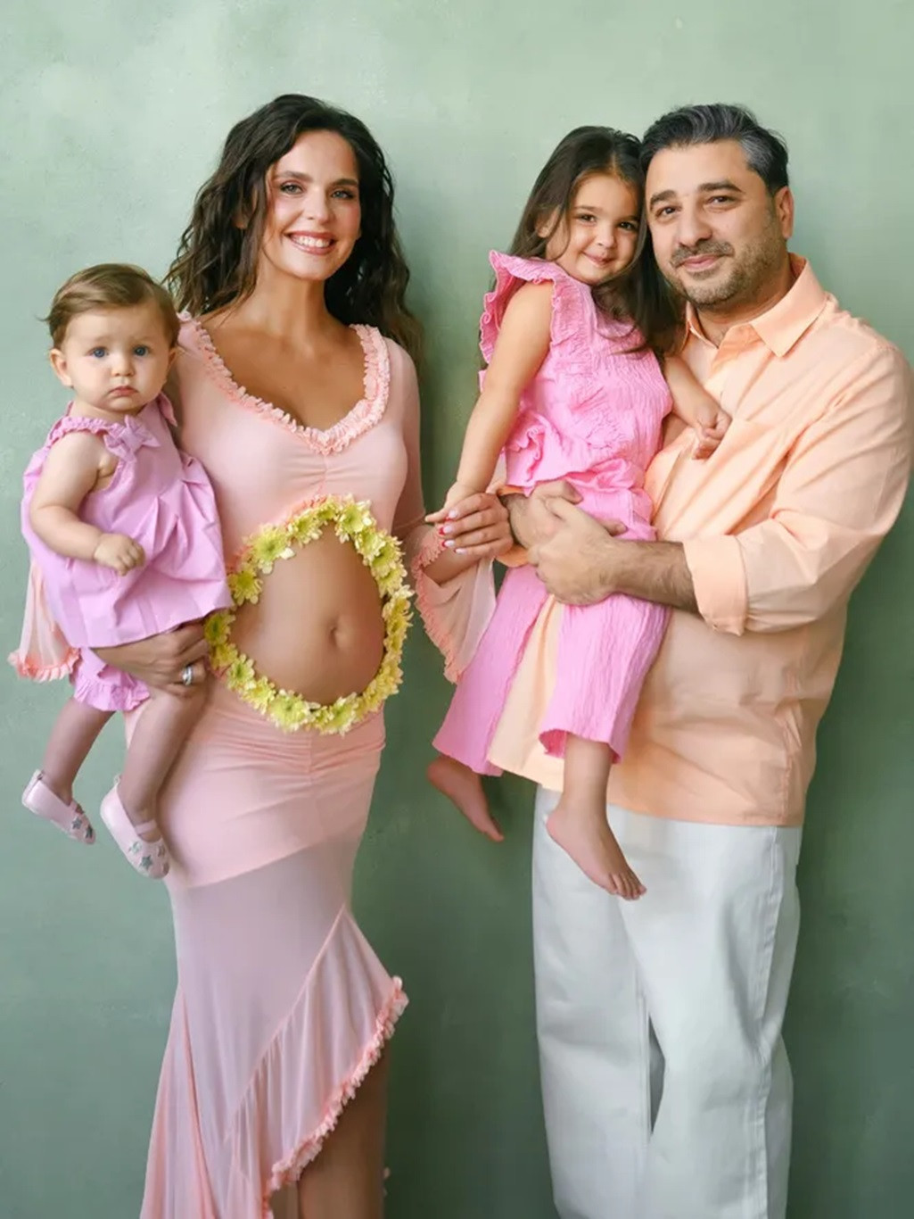 Супруги выложили в соцсети серию снимков с дочками. На Лизе при этом было платье с вырезом на животе, который не оставил сомнений в ее положении.